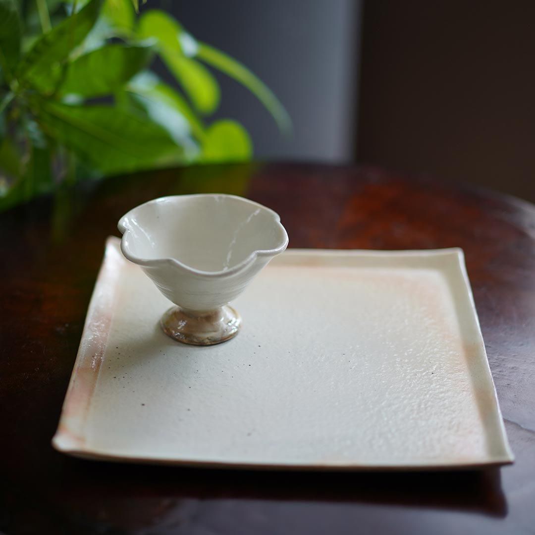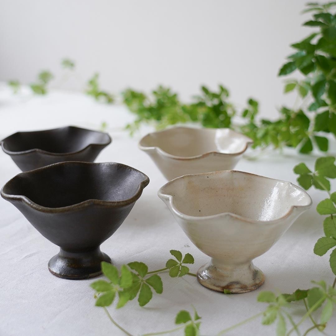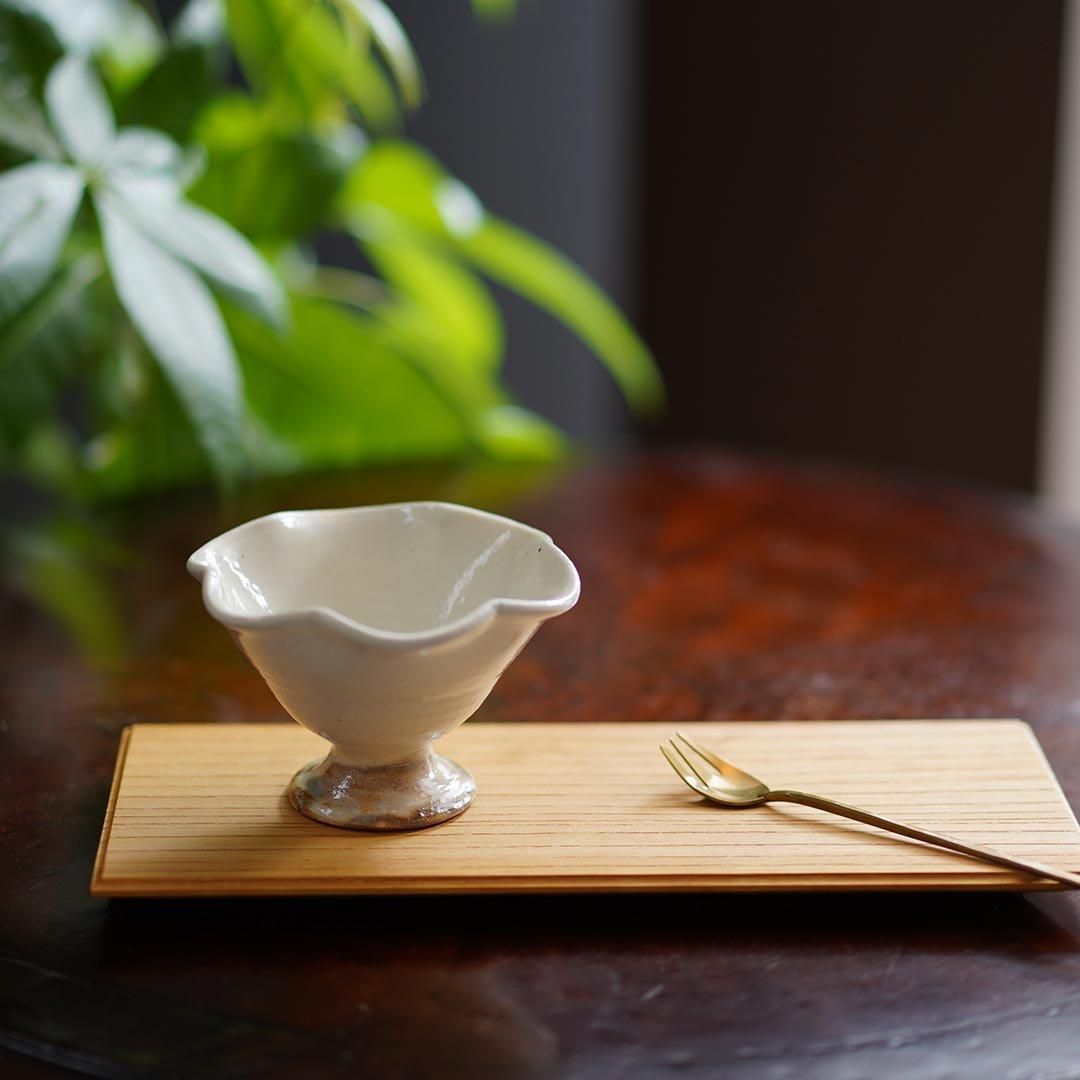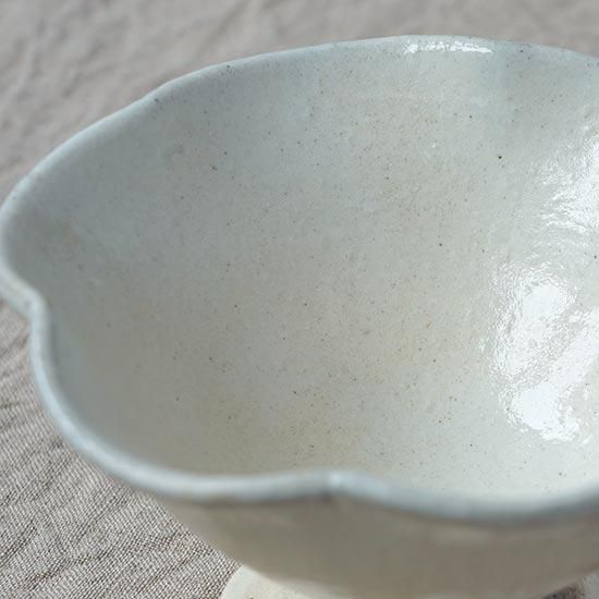 信楽に工房を構える古谷製陶所さんの粉引の輪花高台鉢ミニ。高台があるので、食卓にメリハリをつけ楽しい空間にしてくれます。