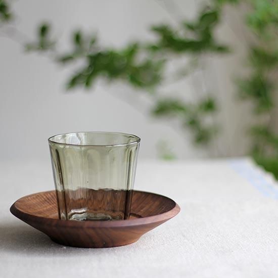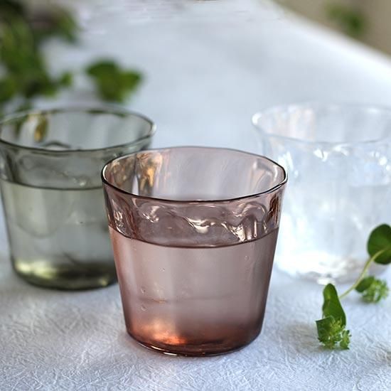 吹きガラス工房floresta fabricaの鈴木努さんデザインの小ぶりなグラス。グラスの縁は、緩やかなカーブがあったり、まっすぐだったり、手しごとならではの揺らぎも感じられるところが魅力です。