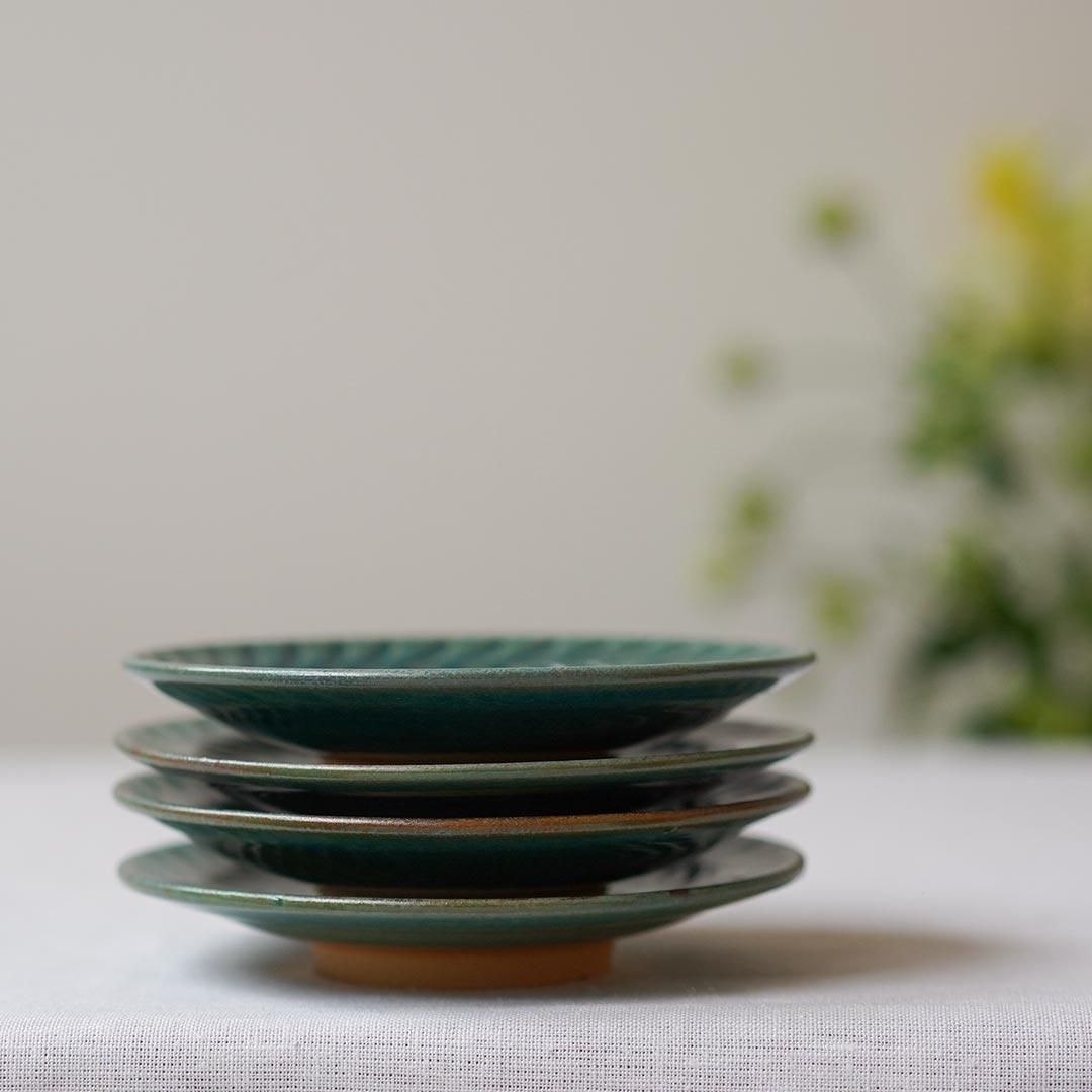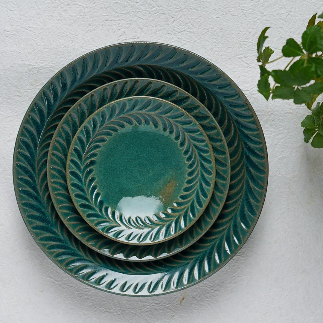 葉紋皿の器は、4寸(12cm)、5寸(15cm)7寸(21cm)の3種類。4寸葉紋皿 トルコブルー / 市野耕