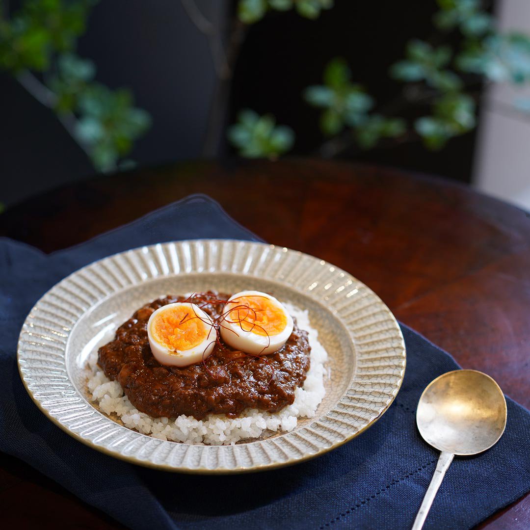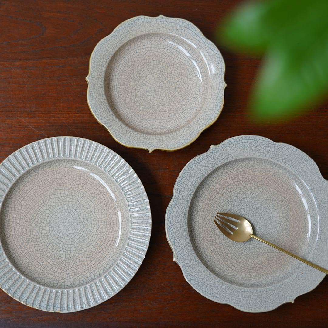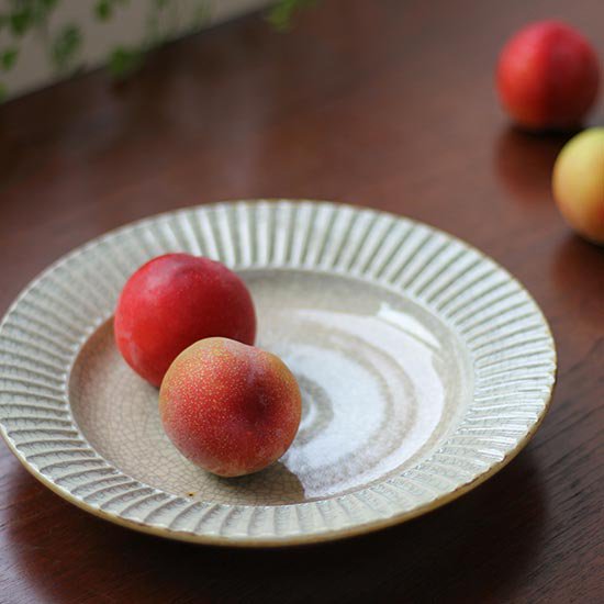 茨城県鉾田市にて作陶されている はなクラフトさんの貫入が美しい約21cmの中皿。丁寧にしのぎが施されたリムによって器に十分な余白ができ、盛った時にお料理がより華やかに見えます。