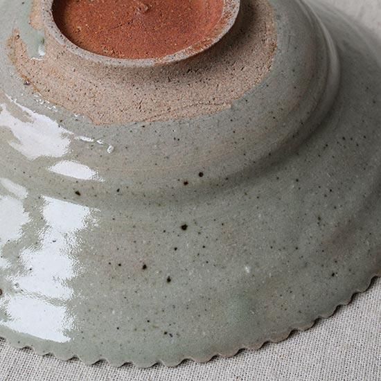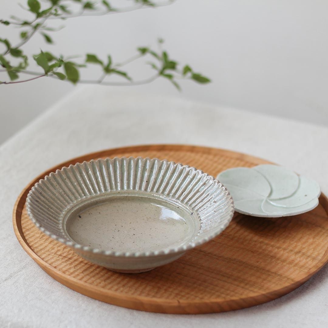佐賀県唐津市で作陶されている岡本修一さんの直径約16cmの鉢。中央に向かって彫られたしのぎが印象的で、お料理をより引き立ててくれます。。