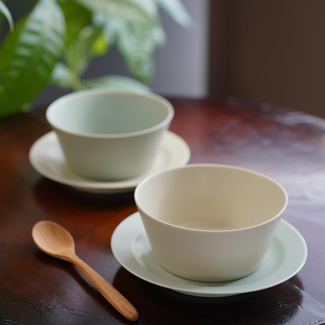 シャーベットのような爽やかなペールブルーは、食卓を明るくしてくれます。さらりとしたマットな質感で手に馴染みます。