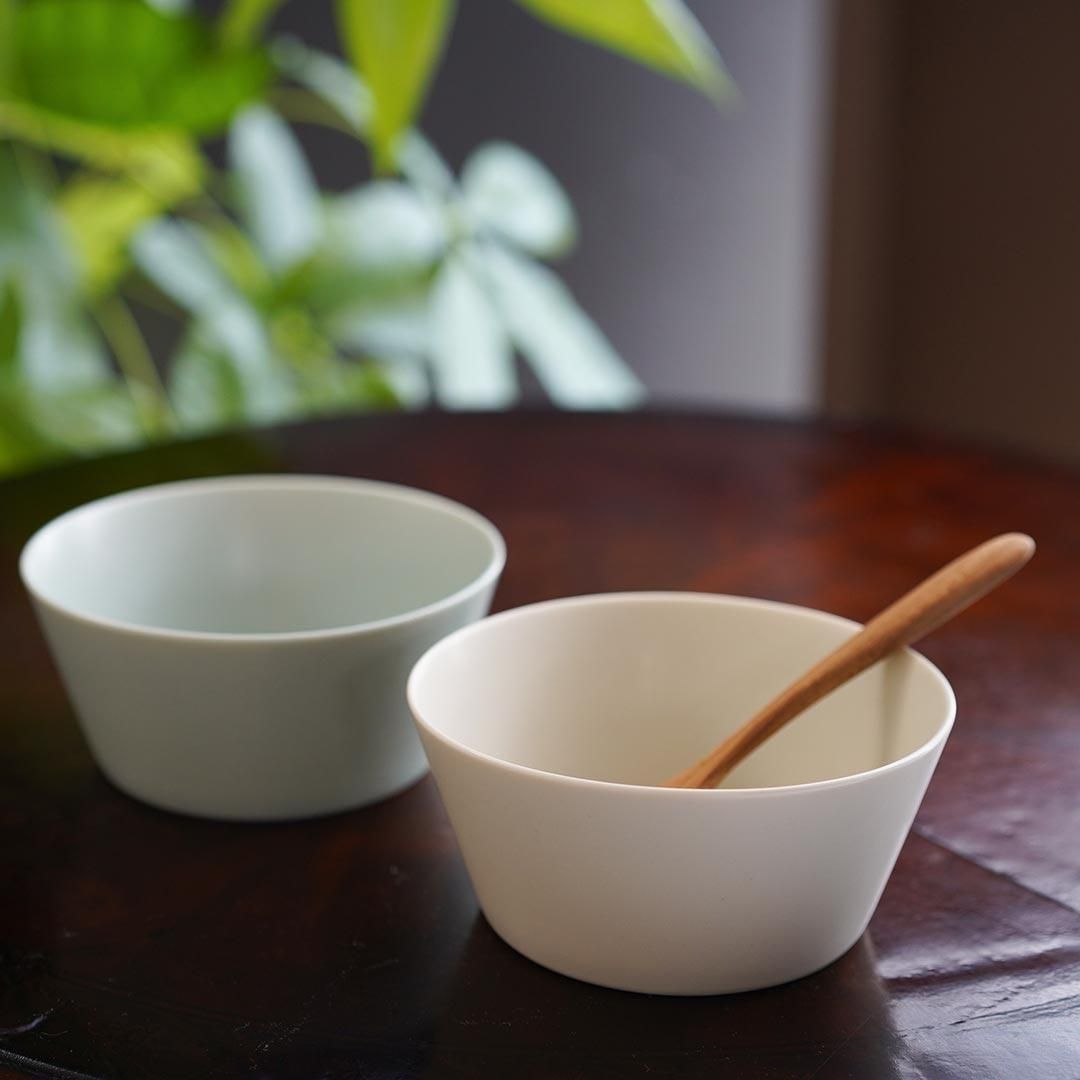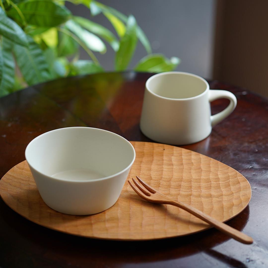 真っ白ではなく、生成り色よりの柔らかな白で、お料理に合わせやすく、暮らしに馴染む色です。さらりとしたマットな手触り。