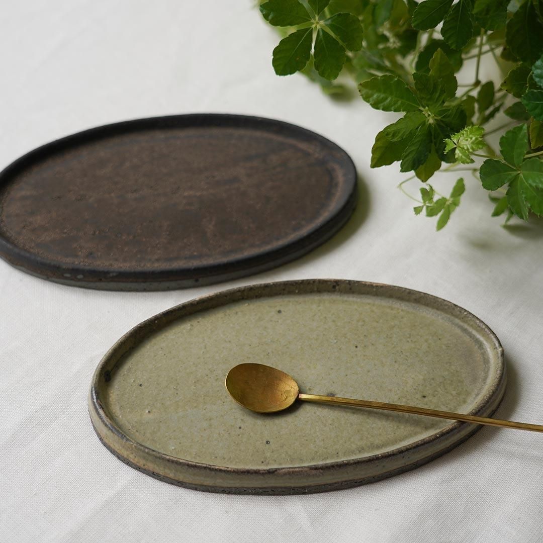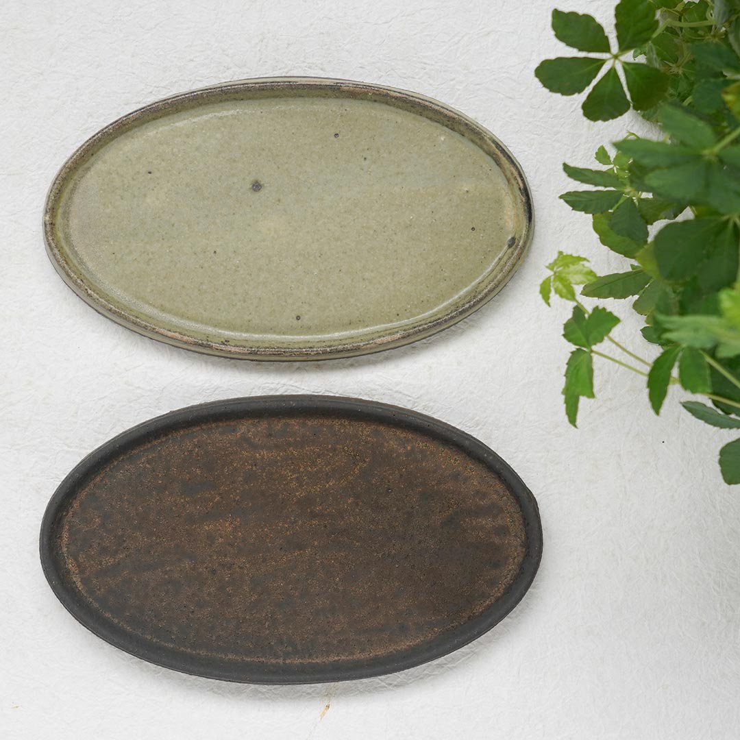 冨部咲喜子さんのオーバルプレートMは、写真上の粉引と写真下の鉄釉の2色です。