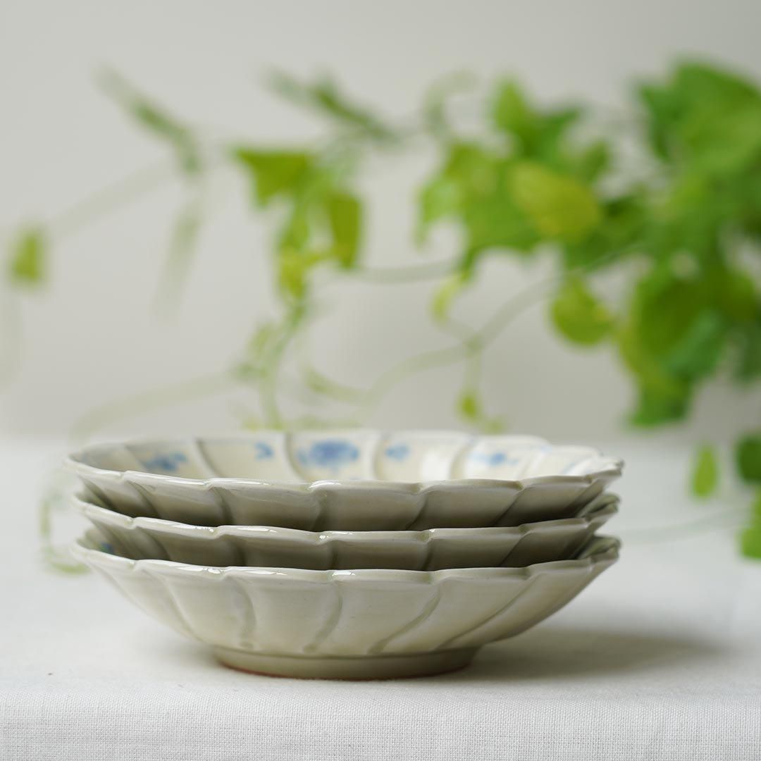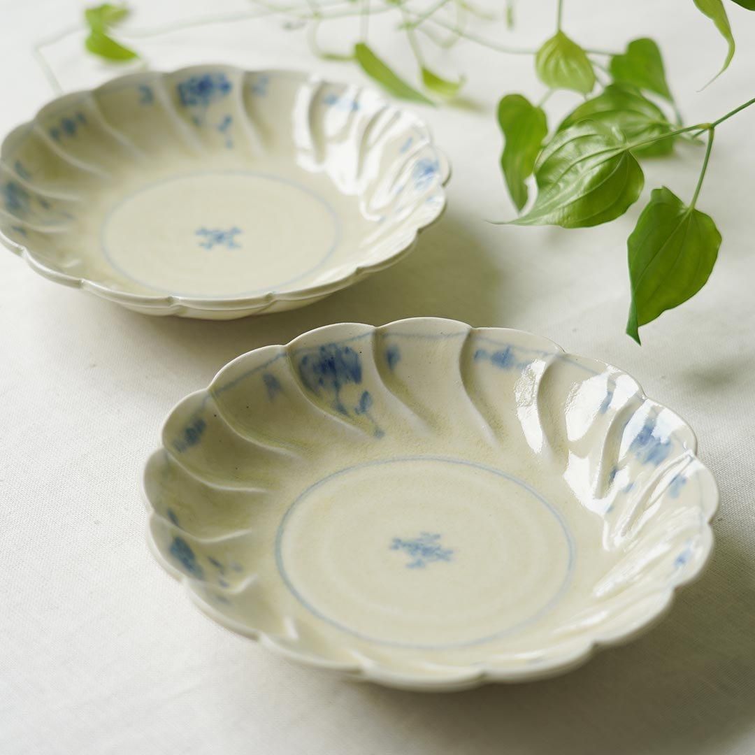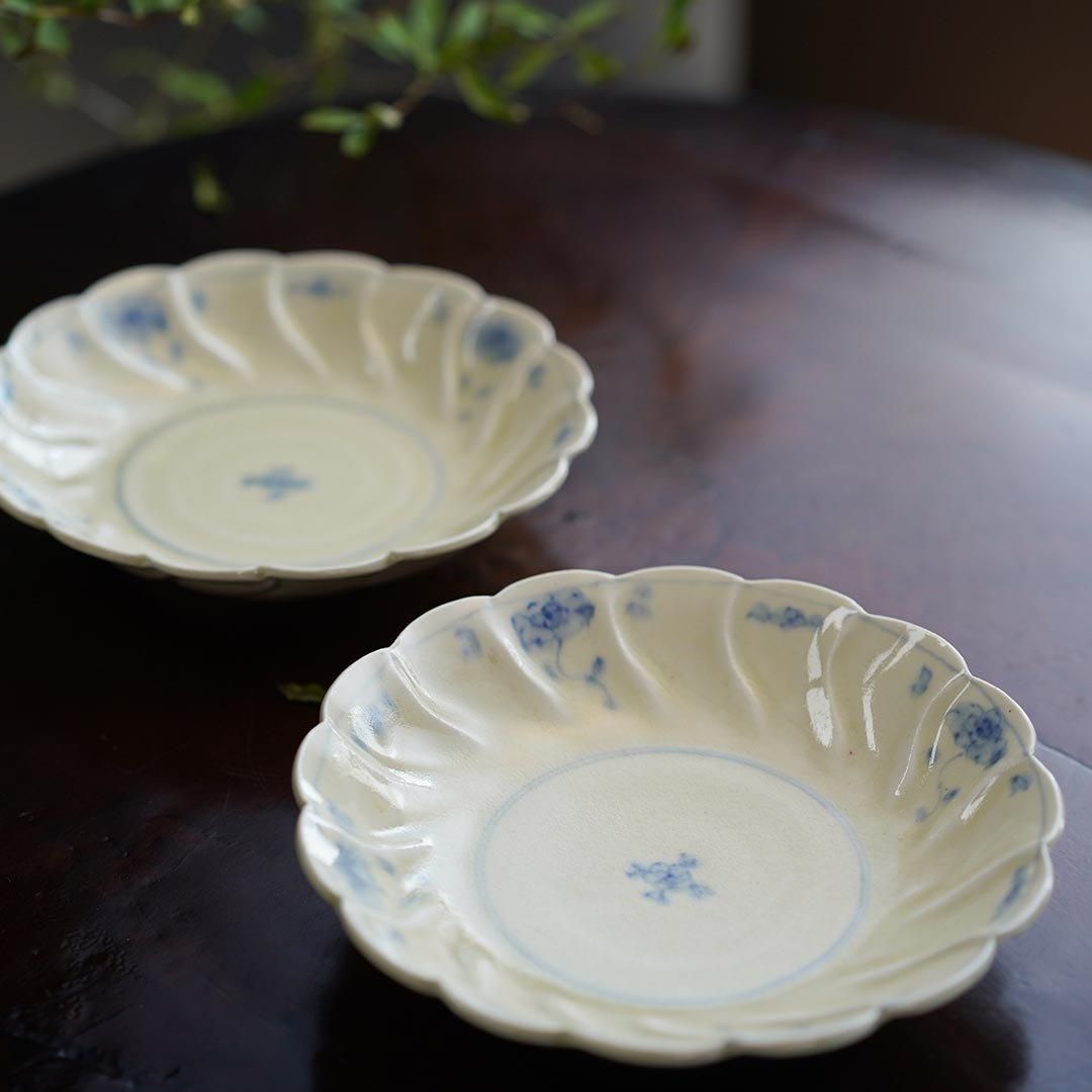 磁土を独自でブレンドした素地に、安南手(あんなんで)というベトナムから伝わる技法で作られた器は、呉須が淡く滲んだように出る染付が、とても優しく柔らかな雰囲気です。