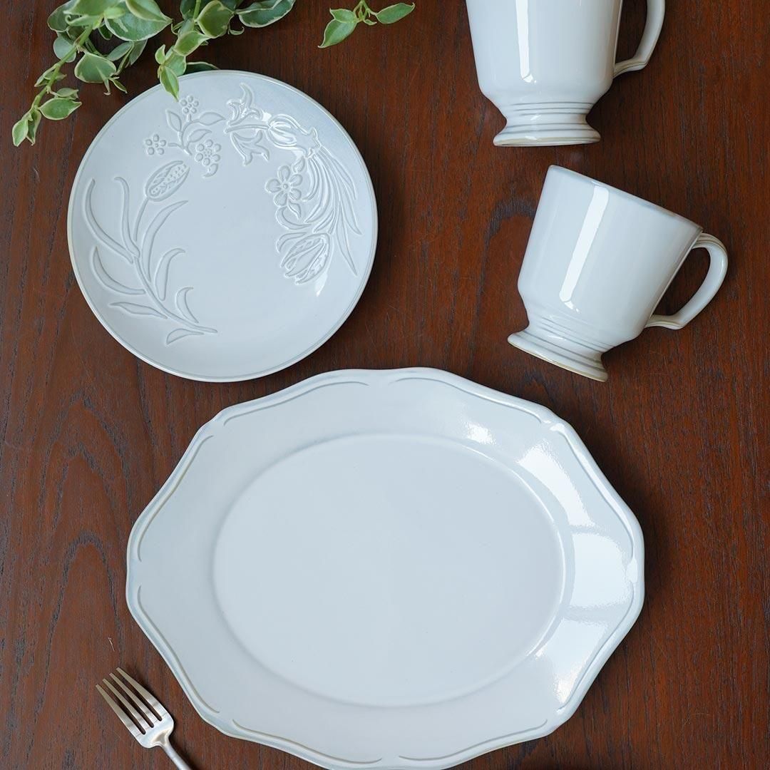 マルミツポテリさんの楕円のお皿。花のようなリムの部分が美しくまるでアンティークのような装いのうつわです。