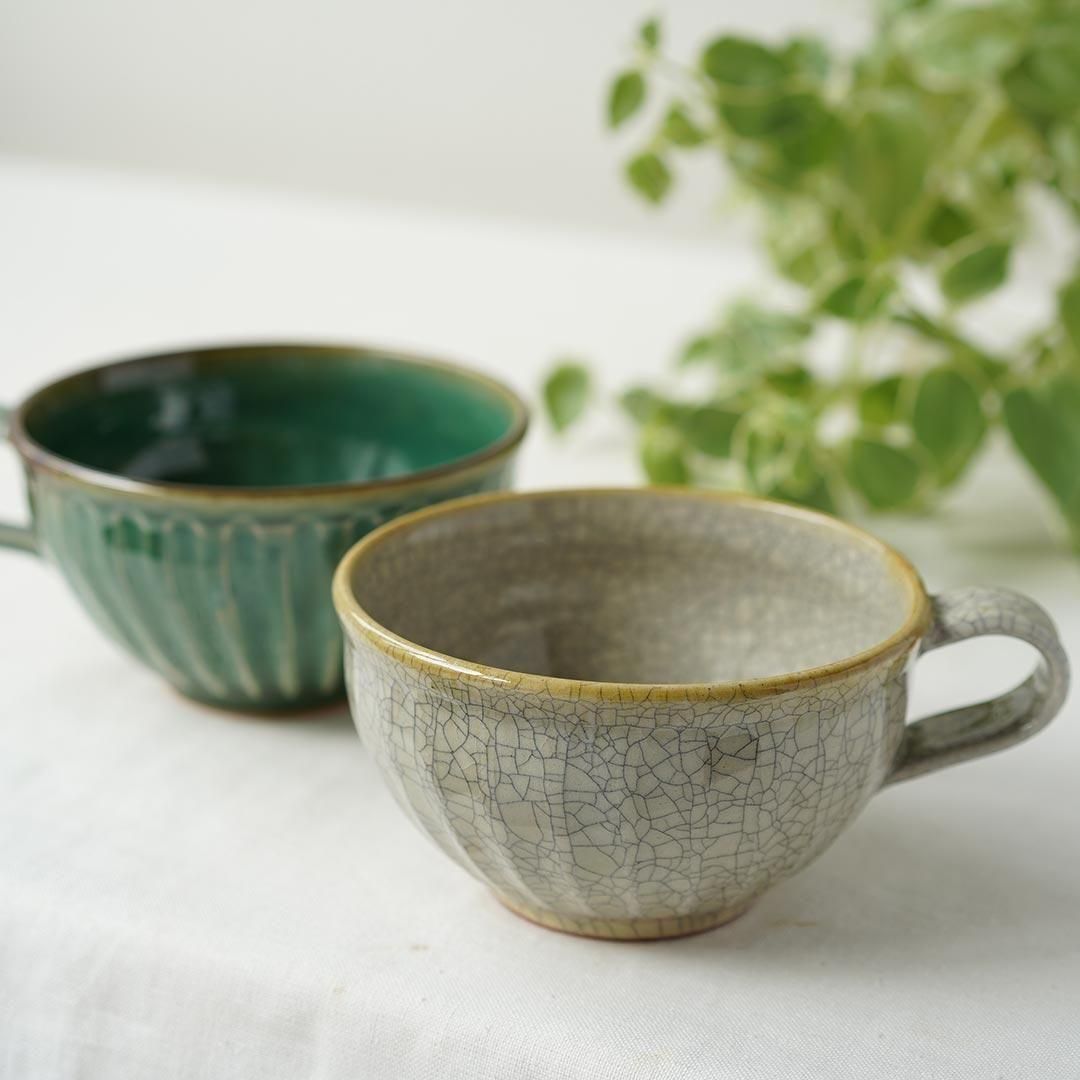 茨城県鉾田市にて作陶されている はなクラフトさんの貫入が美しい持ち手がついたたっぷり入るスープ碗。持ち手も大きく持ちやすいので普段使いができるスープカップです。