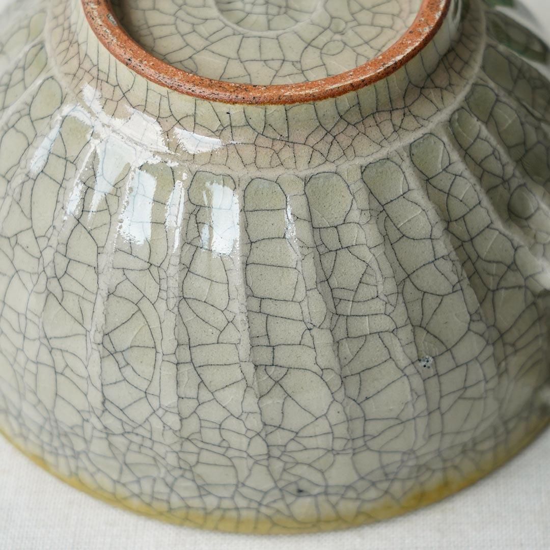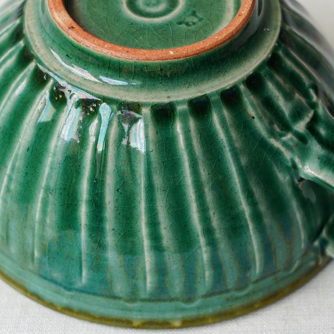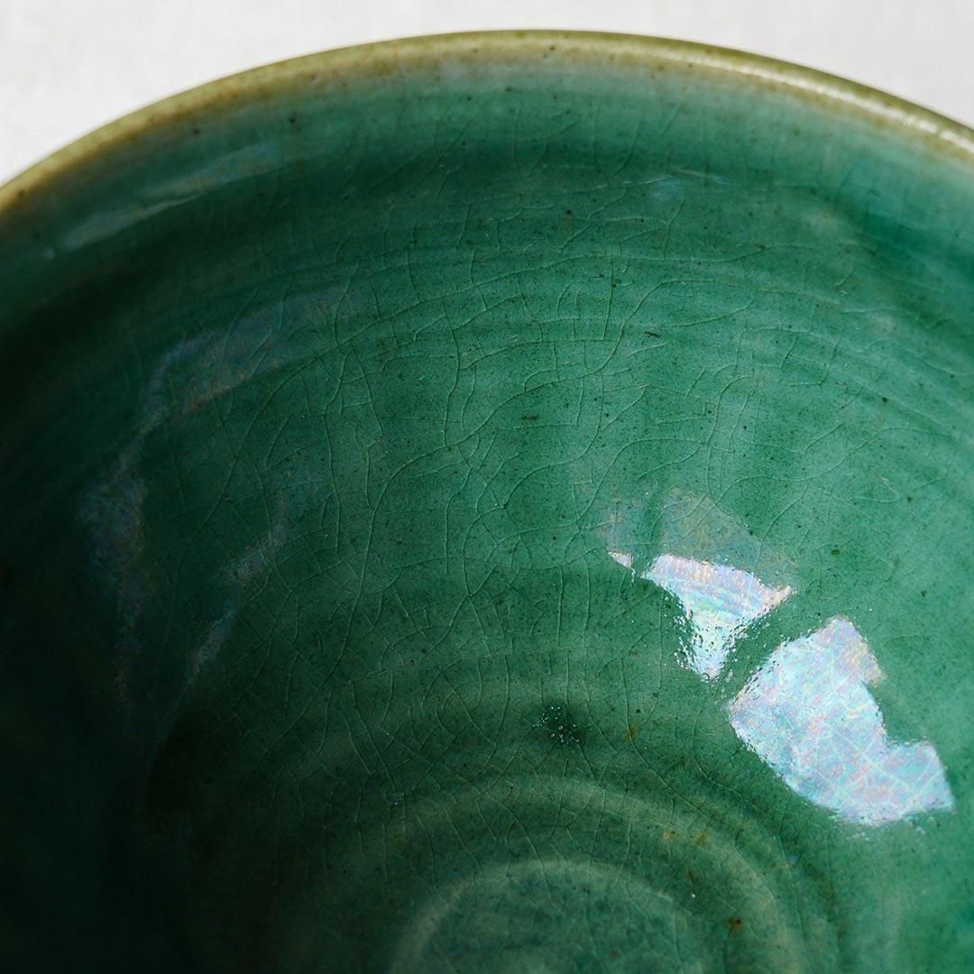 綺麗な深い緑色で、貫入、釉薬の濃淡や、縁部分の焼き色など、表情豊かで二つとして同じものがない器です。落ち着いたツヤがあり、手触りもよいです。
