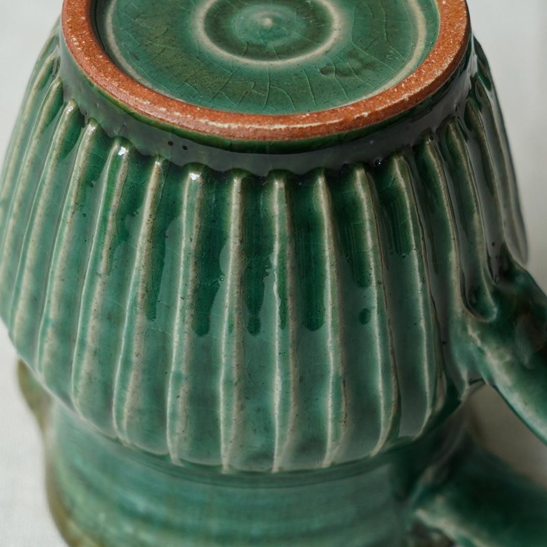 綺麗な深い緑色で、貫入、釉薬の濃淡や、縁部分の焼き色など、表情豊かで二つとして同じものがない器です。落ち着いたツヤがあり、手触りもよいです。