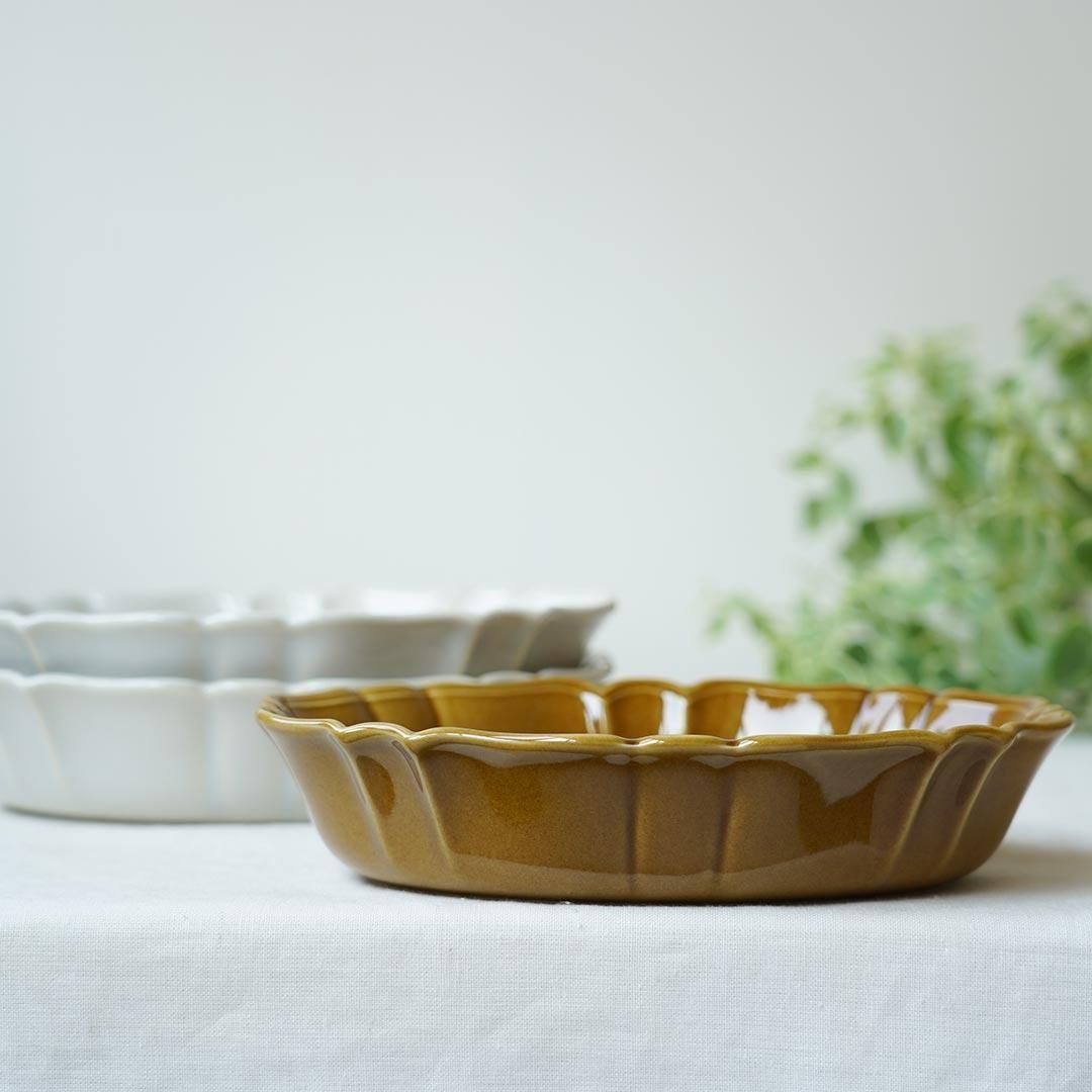 ラコットクルンプリはハンガリーの料理の名前。花や貝殻を思わせる、一年中使いたくなるようなエレガントさと色合いで、南仏のような雰囲気のオーブンウェアです。
